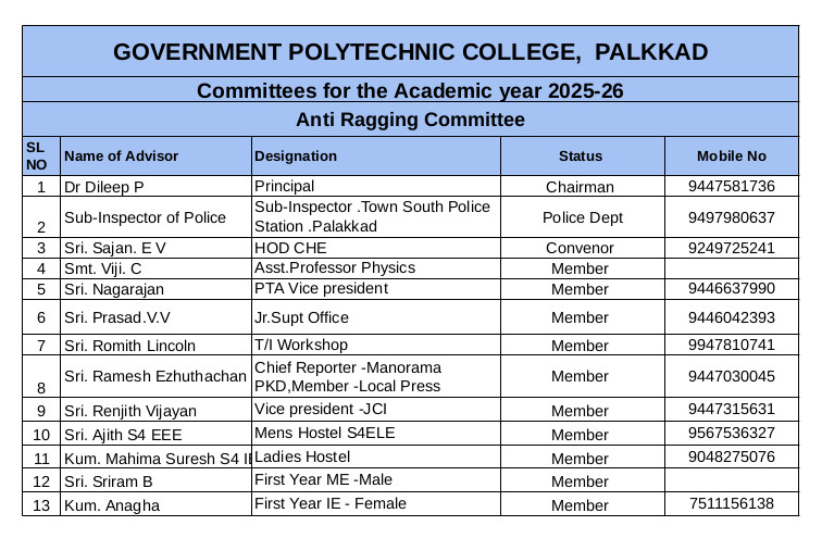 As per the directions of Hon’ble Supreme Court of India, an Anti Ragging Committee has been constituted in this institution with the following officials :